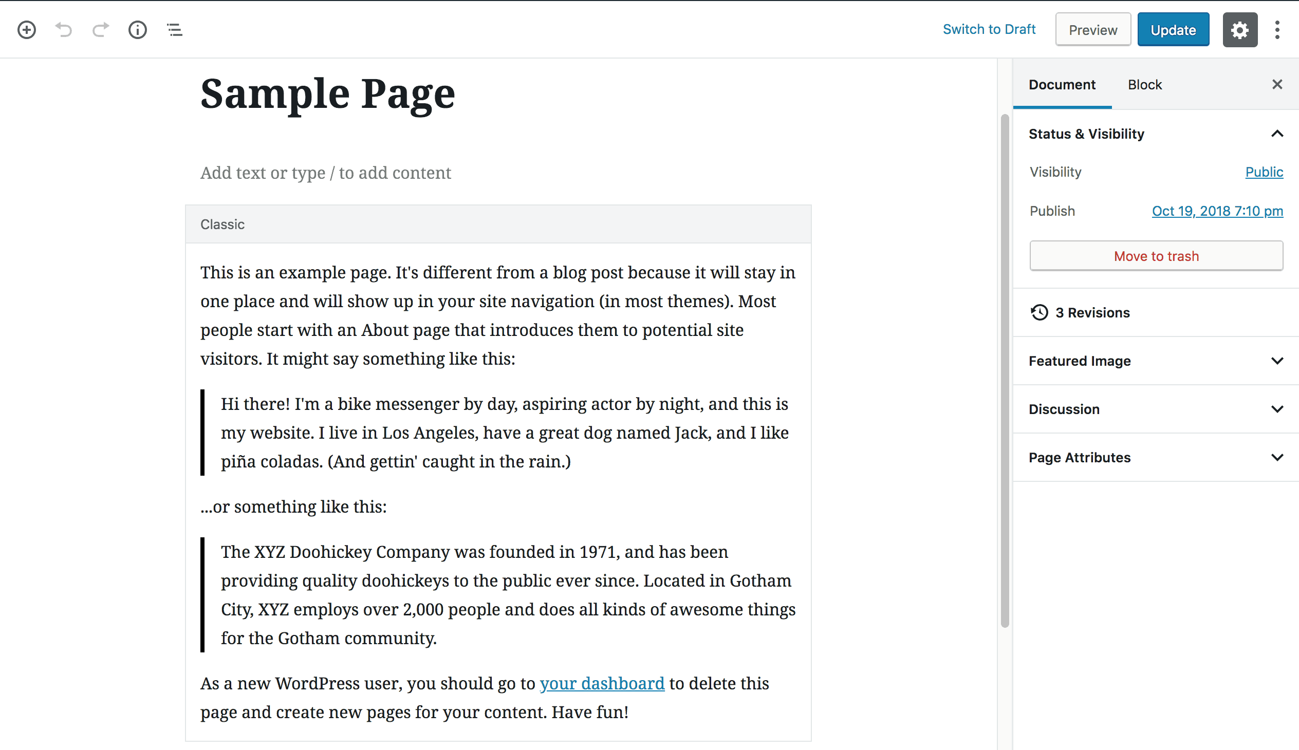 If you have been using WordPress consistently for the last year or more, you would’ve already heard about Gutenberg, WordPress’ up and coming new editor, and replace the classic TinyMCE editor. But for those of you that don’t know, here are examples of the TinyMCE (a.k.a. the classic editor) and Gutenberg editor (a.k.a. the block editor) on a Sample Page.